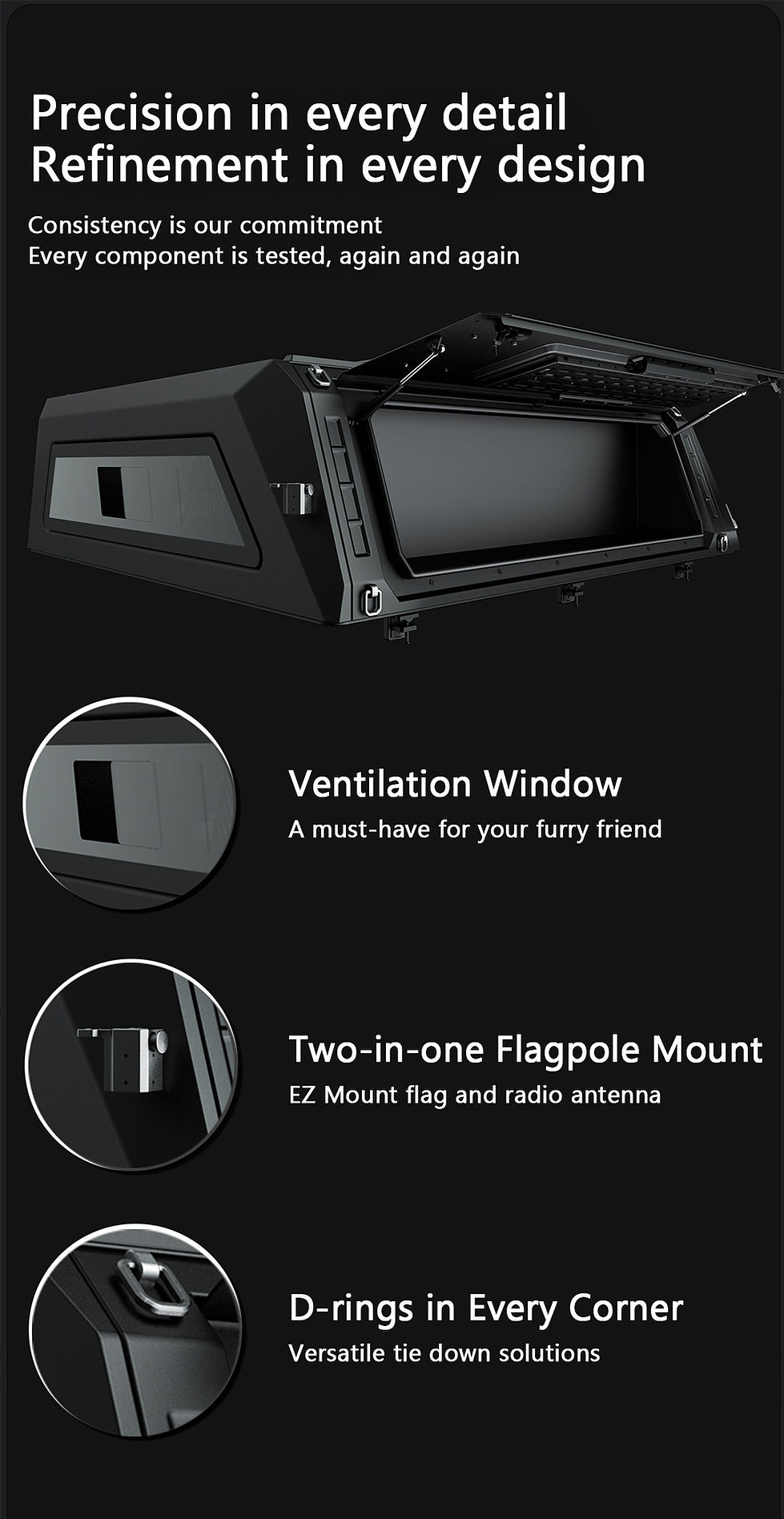 The JD10 combines modern aesthetics with rugged functionality, making it a standout addition to any truck. Its sleek, low-profile design enhances the truck’s appearance while maintaining aerodynamic efficiency. Built from high-strength aluminum, it is both lightweight and durable, ensuring long-term reliability without adding excessive weight. The gullwing doors and MOLLE panels provide quick access and versatile storage solutions for adventurers and professionals alike. Designed for performance and practicality, the JD10 features weatherproof seals, integrated roof rails, and reinforced construction, making it the ultimate truck cap for both work and play.